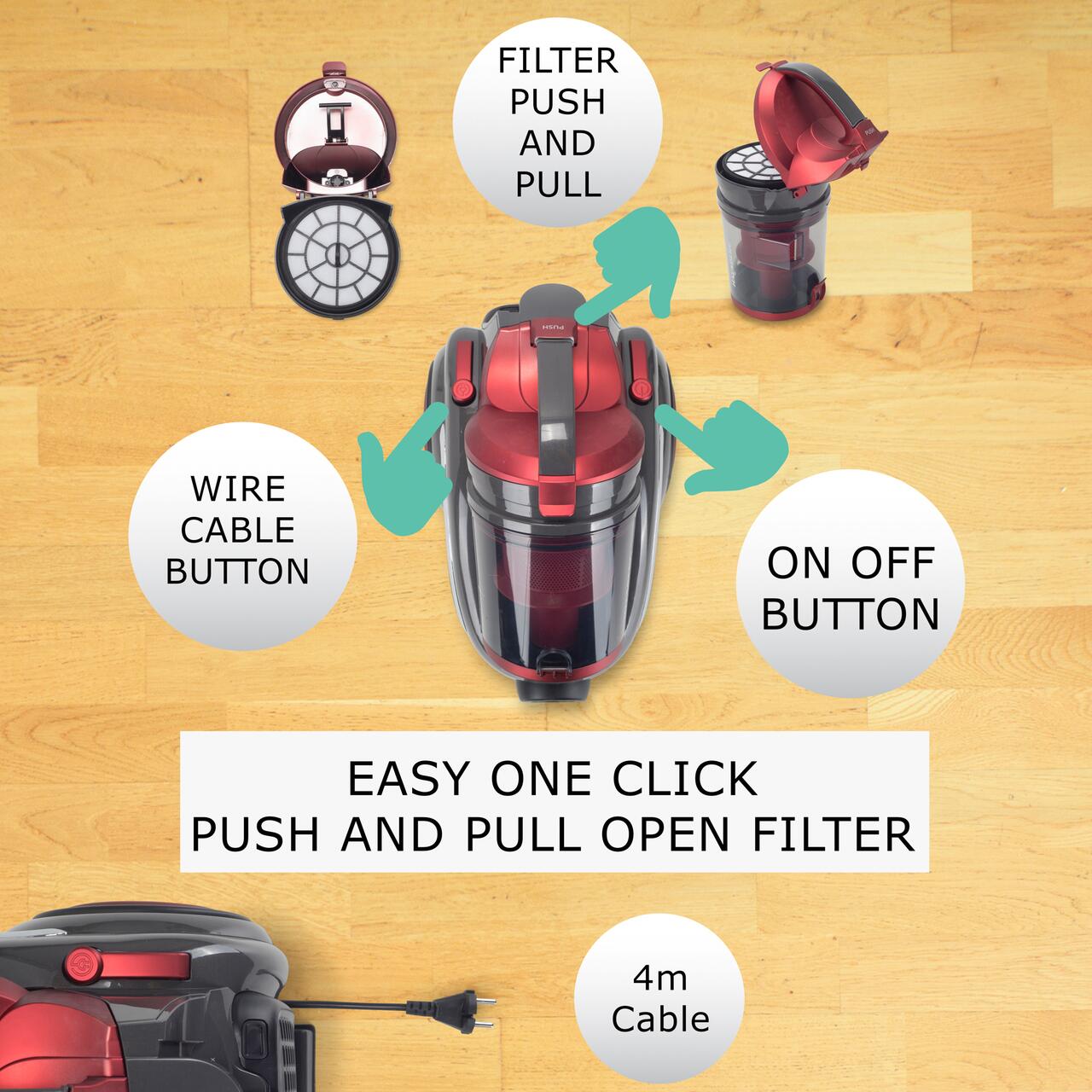 - Maximális teljesítmény 2200 W: A 2200 W-os szívóteljesítményű Hausberg HB-2820RS porszívó segít a nehezen hozzáférhető felületek tisztításában.