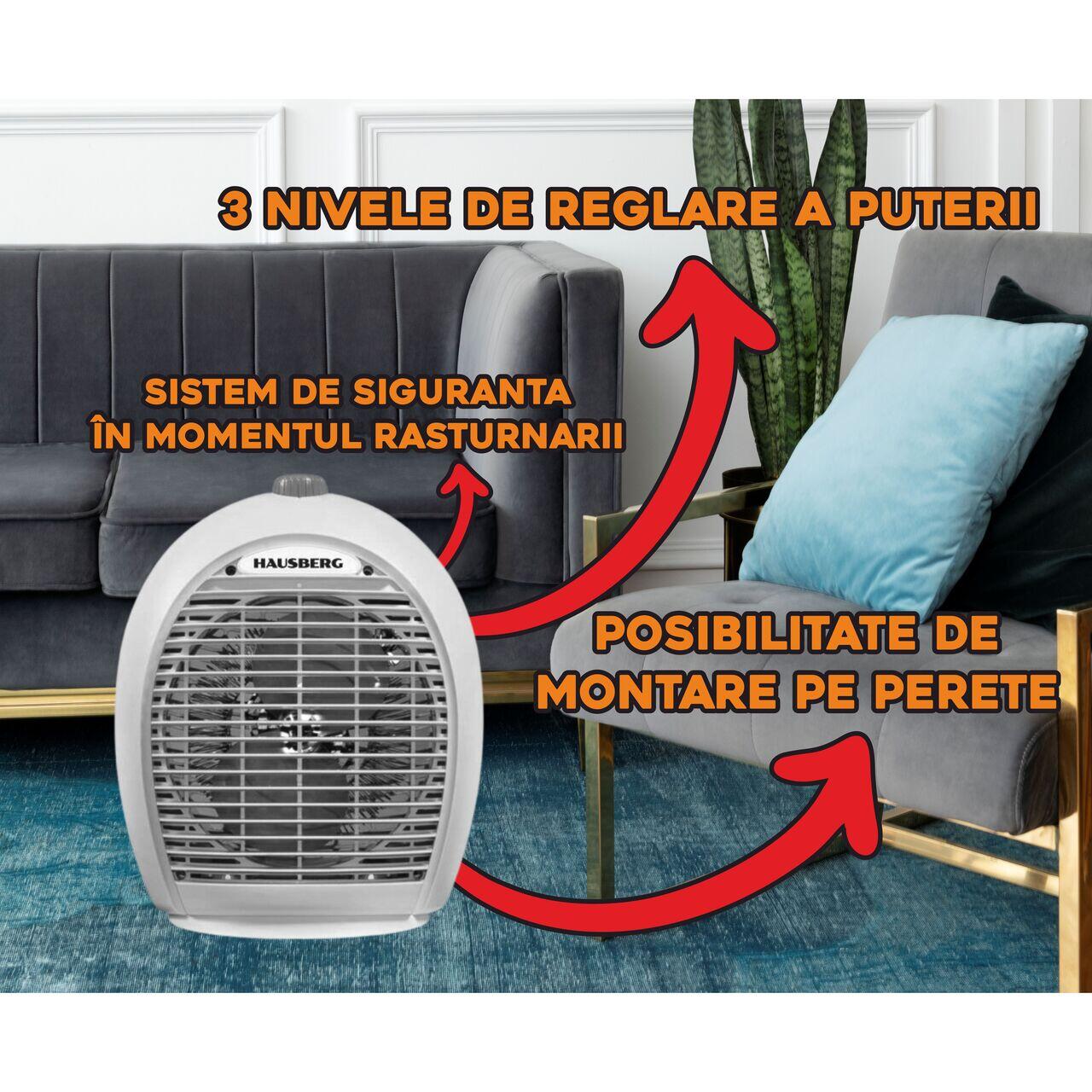 Aeroterma Hausberg HB-8504AB, 2000W, 3 trepte de putere, termostat reglabil, protecție la răsturnare, montaj pe perete, alb