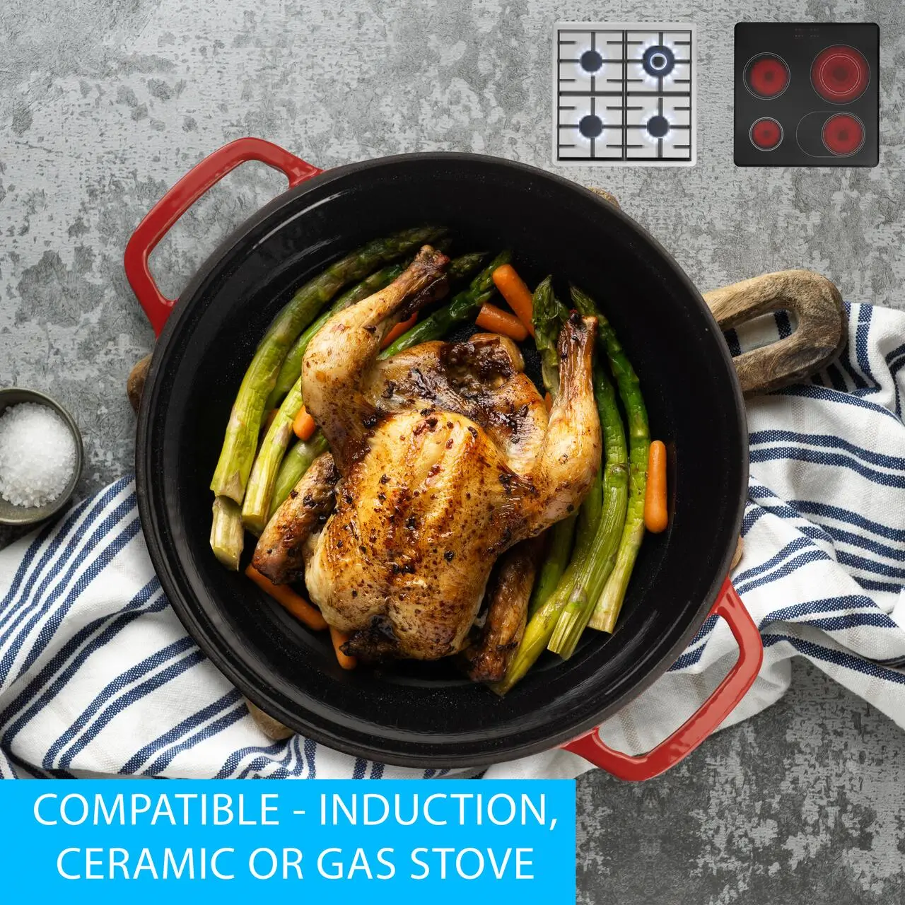 Capacul greu din fontă ajută la menținerea căldurii în interior, permițând gătirea lentă și eficientă a preparatelor.